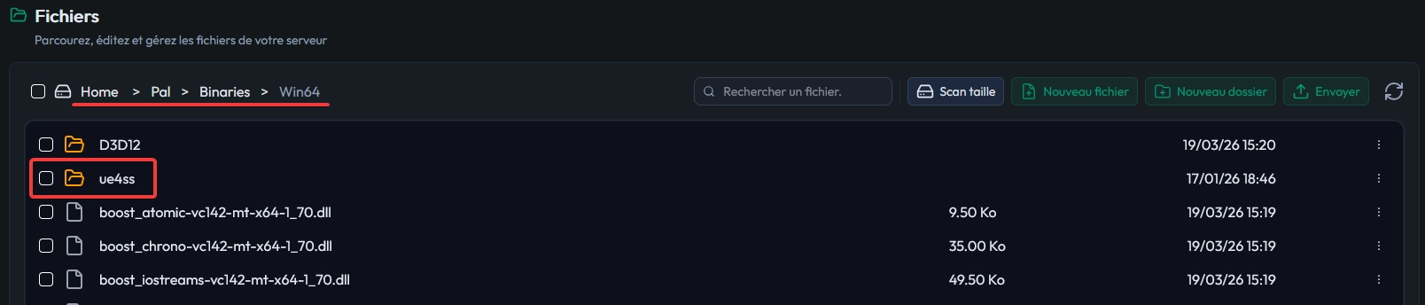 Dans l'onglet Fichiers du Mineboard de votre serveur, naviguez jusqu'au dossier racine de Palworld, puis déposez les fichiers de UE4SS dans le répertoire suivant :