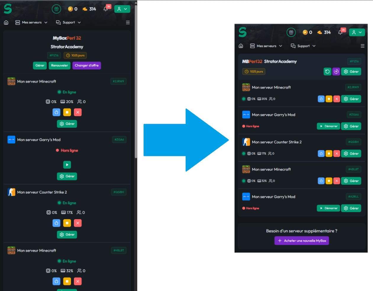 Côté MyBox, plusieurs évolutions majeures renforcent votre autonomie et simplifient la gestion de vos serveurs, du test rapide au projet long terme. L’idée est de vous laisser la main, sans avoir à ouvrir un ticket pour chaque action.