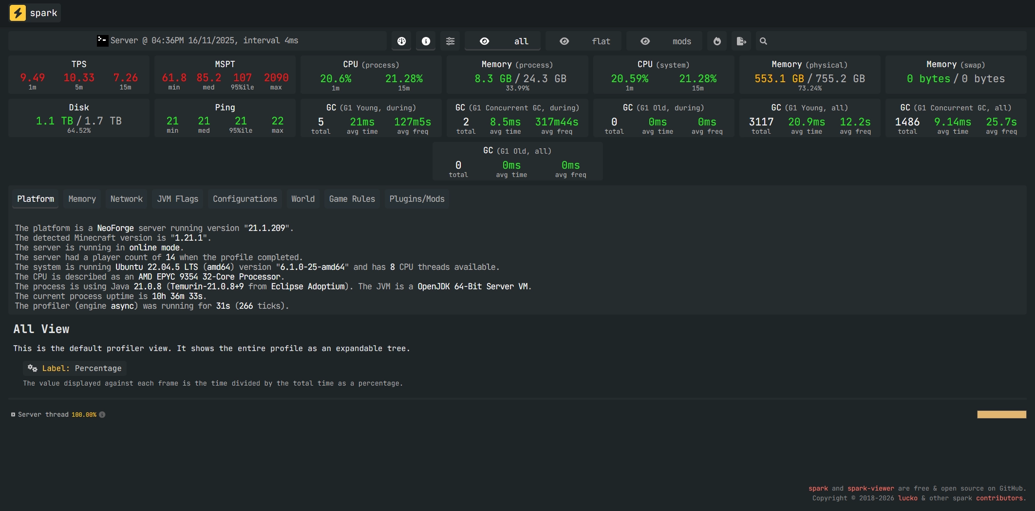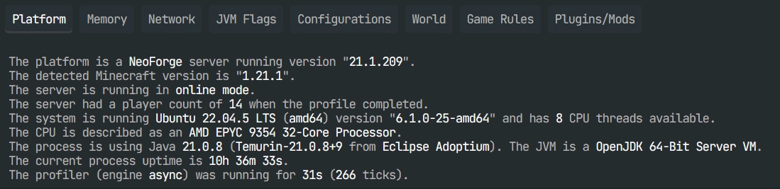 Cette section résume votre environnement : version serveur, liste des plugins/mods, paramètres JVM et plusieurs autres paramètres. Elle aide à avoir un aperçu rapide sur le nombre de joueurs connectés, la durée du Spark, le nombre de ticks ainsi que de nombreuses informations intéressantes.