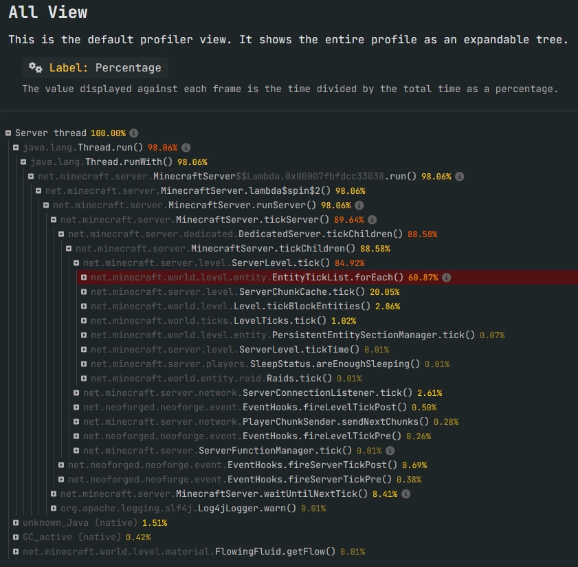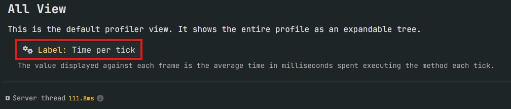 Par défaut, l'affichage est en pourcentage, mais nous recommandons la lecture en "Time per tick" qui permet d'identifier clairement la durée d'une tâche dans un tick. La valeur normale d'un tick est de 50ms pour que votre serveur tourne à 20 TPS.