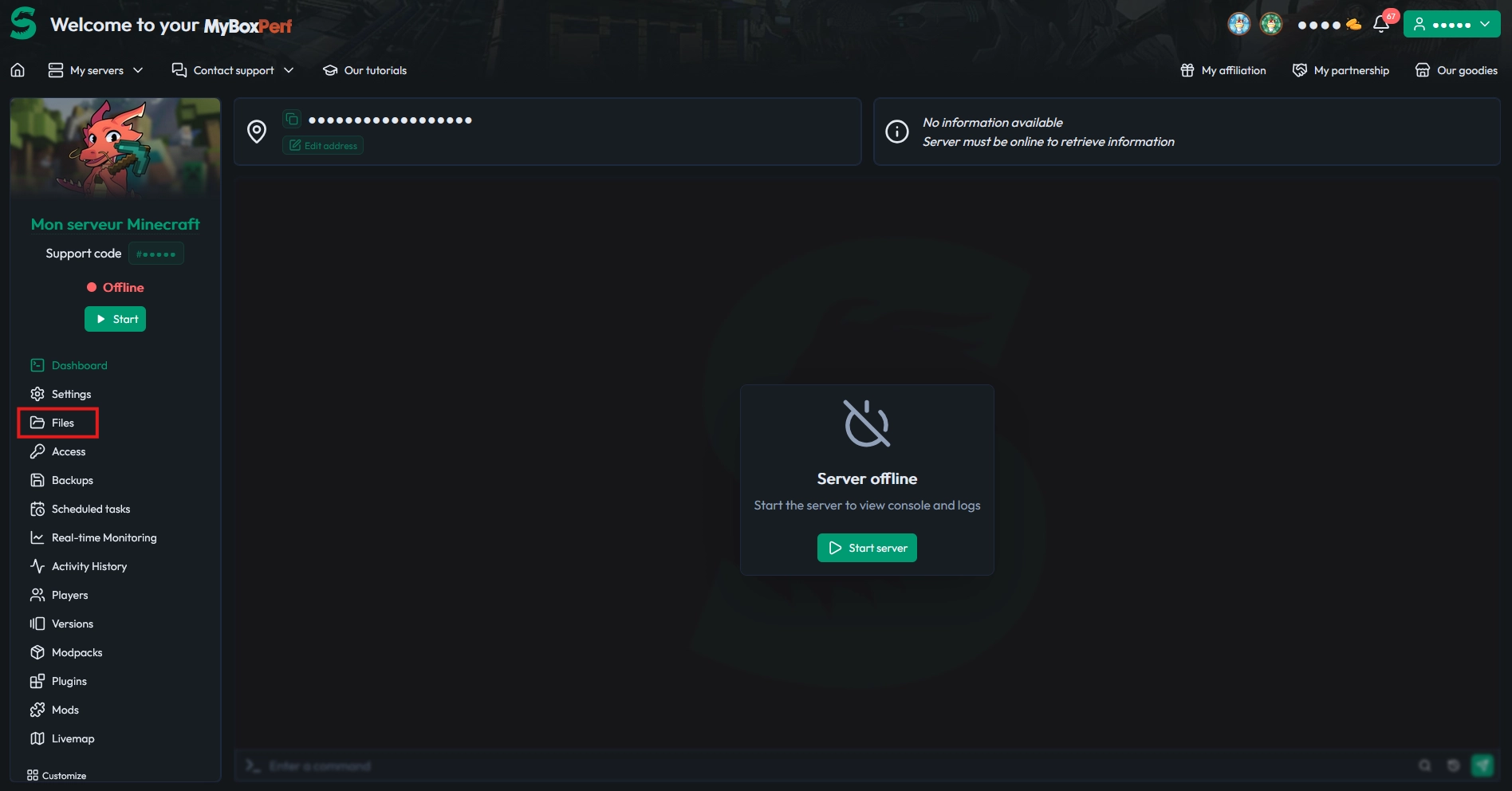 Before you can download the world from your Minecraft server, you need to access the files through the MineStrator panel. Everything is done directly from your browser, no FTP client is required.