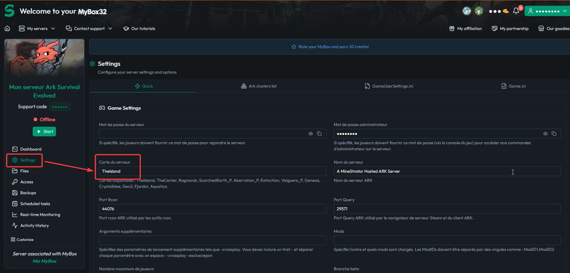 Once this is done, go to your Settings in the panel. Then change the "Server Map" (Carte du serveur) value to the ID of the map you had in single-player.